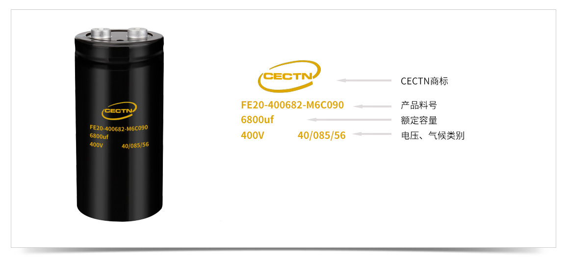 ? ? ? ? 鋁電解電容的料號(hào)又兩個(gè)部分組成,上面是CECTN商標(biāo),下面為電解電容型號(hào),包含訂購(gòu)代碼、電壓、容量、溫度、壽命、安裝方式等信息。詳細(xì)了解請(qǐng)點(diǎn)擊進(jìn)入《凱琦佳鋁電解電容料號(hào)說明》頁(yè)面。